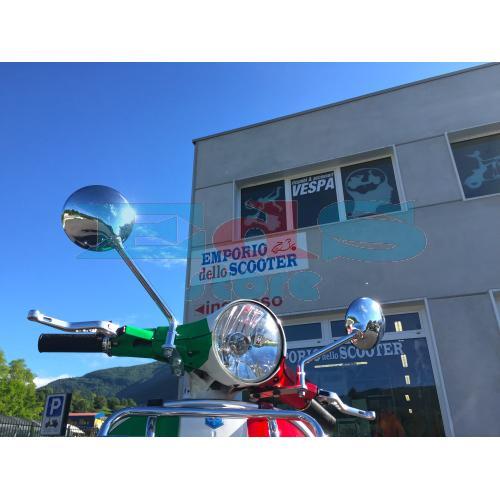 Specchietto retrovisore tondo in ferro cromato, uno dei migliori in commercio per Vespa, vibra poco ed è venduto senza staffa.